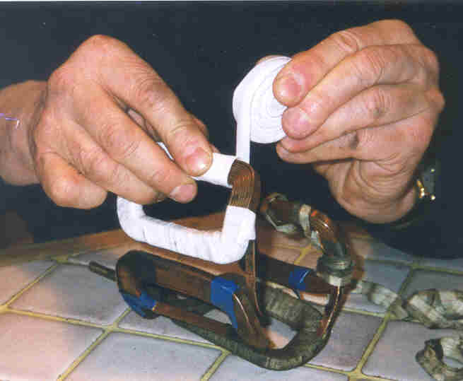 | Isolation: Si cette dernière est abimée comme vue précédemment, alors de la patience, encore de la patience et toujours de la patience ! mon dieu, qu'est ce qu'il faut en faire de tours pour refaire l'isolation des bobinages ! Et savez vous avec quoi vous refaites l'isolation ? et bien vous allez à la mercerie du coin et vous achetez de la bande de COTON (pas en polyester) pour bas de jambe de pantalon ! Attention, évitez les sur-épaisseurs sinon l'armature ne passera plus entre les bobinages.. | |||||||||||||||